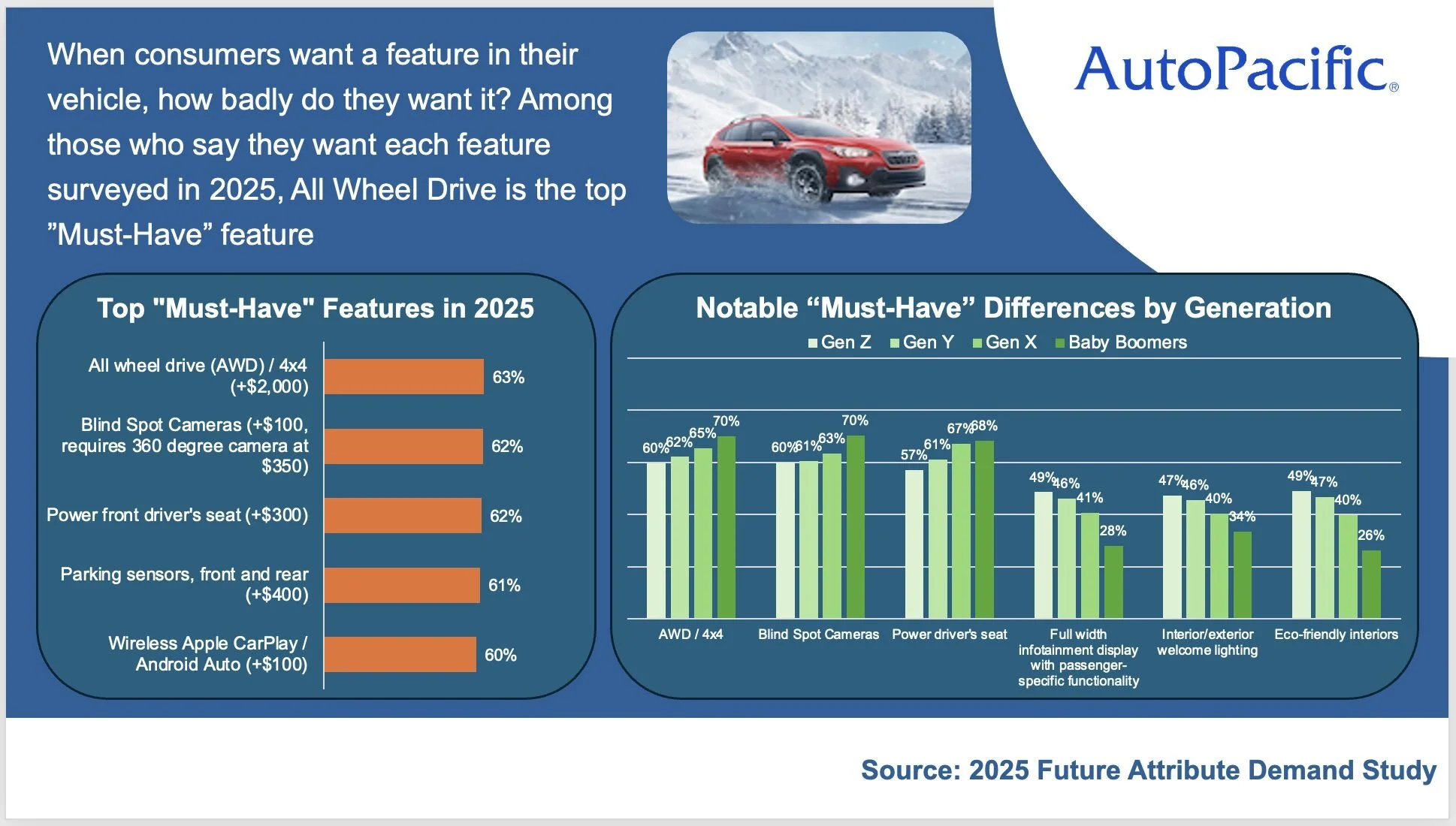 The top "must-have" feature for 2025 is all-wheel drive, with 63% of all respondents who want the feature saying they won't buy a vehicle without it. A closer look at demand reveals that older vehicle intenders are more likely to consider it a must-have feature compared to younger intenders, yet must-have demand is strong across all generations. Our comprehensive data, like the scope presented here, enables deep-diving into feature demand by looking at intender demographics, psychographics, segment and powertrain intention, brand consideration, and more.