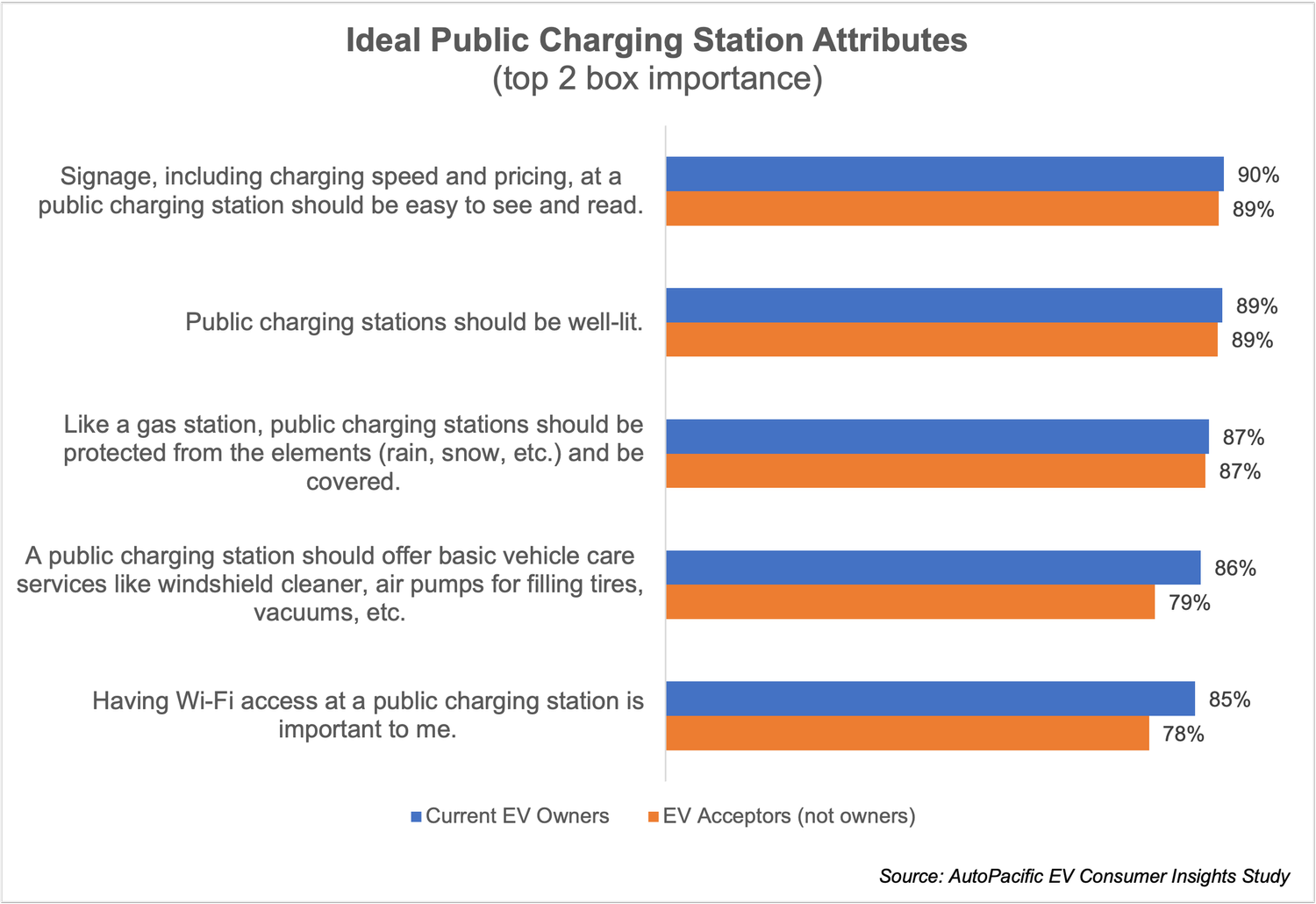 Current public charging stations for electric vehicles are far from meeting consumer wants and expectations. According to data from AutoPacific’s recent EV Consumer Insights Study, future EV consumers have a long list of charging station attributes that are important to them. From easy-to-see and read charging speed and pricing signage to offering additional basic vehicle care services like windshield cleaner, air pumps for filling tires, and vacuums, future EV consumers would like a public charging experience that more closely mirrors traditional gasoline fueling stations.