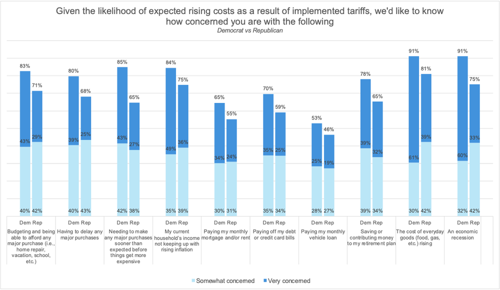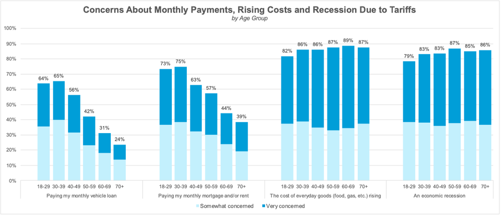 Interestingly, the older consumer groups surveyed, those age 60 and older, as well as those who are retired, have the least concern about tariffs personally affecting them. As most older consumers have likely paid off their mortgage and possibly their vehicle loan, only 39% are concerned about paying their monthly mortgage or rent compared to 73% of respondents ages 18-29. Similarly, only 24% of respondents ages 70 and older are concerned about paying their monthly vehicle loan compared to 64% of respondents ages 18-29. However, the likelihood that older respondents are on a fixed income may contribute to their concerns about the rising cost of everyday goods and an economic recession; both concerns they have in common with the younger respondents.