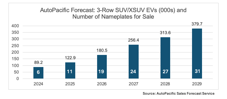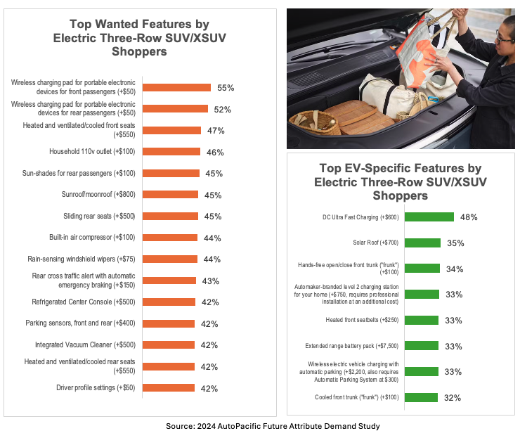 Data from AutoPacific’s 2024 Future Vehicle Planner, which surveyed over 14,000 consumers who intend to acquire a new vehicle within the next three years, revealed nearly half of all future three-row SUV/XSUV shoppers would consider purchasing one that’s specifically an EV and another 8% actually intend to do so – a high percentage considering the limited options currently available.