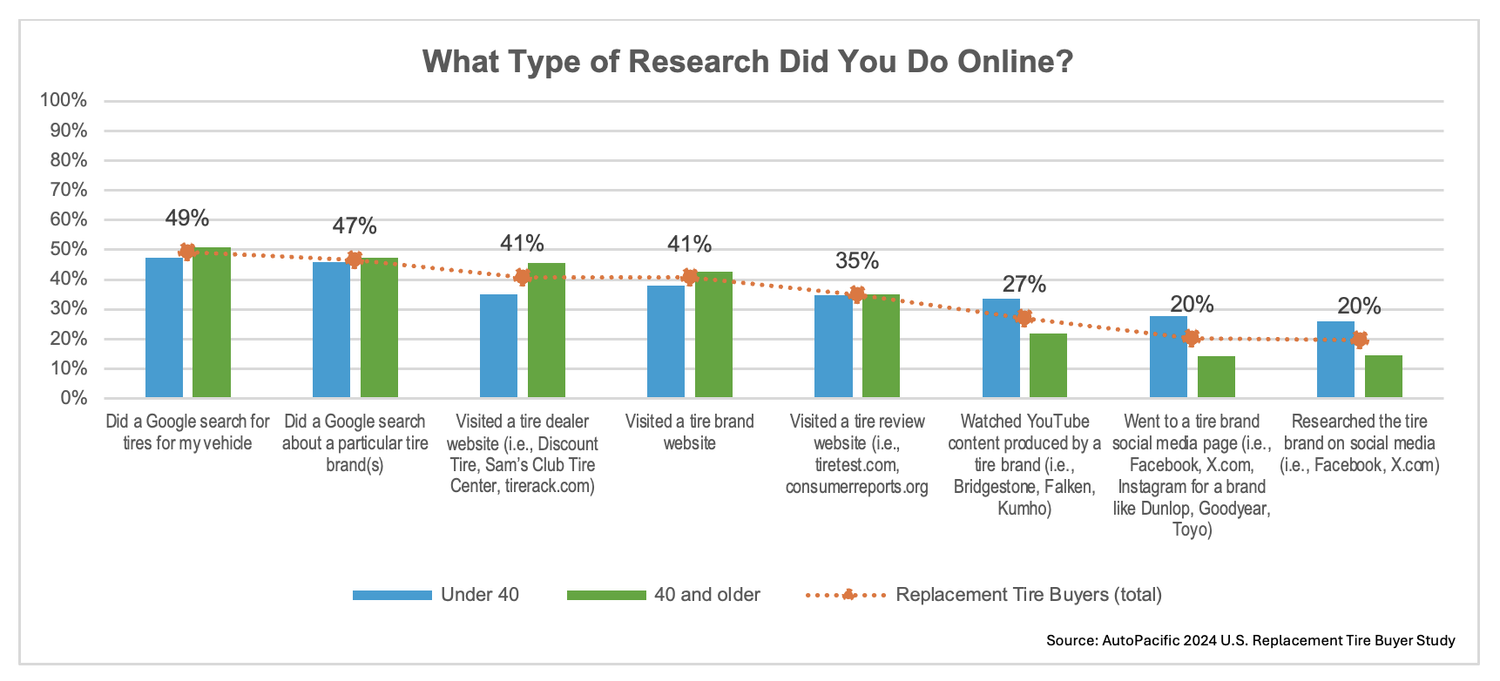Consumers have a wealth of information available at their fingertips, and not surprisingly, the top activity done by replacement tire buyers during the shopping process is checking pricing and promotions, followed by checking tire ratings and reading tire reviews. When asked specifically about research done online, a simple Google search topped the list as tire shoppers were most likely to do a Google search for tires for their vehicle (49%) or about a particular tire brand (47%), followed by visits to a tire retailer website such as Discount Tire or Sam’s Club Tire Center (41%). While researching tires on social media is at the bottom of the list of online research activities for the total sample of replacement tire buyers, it is age-dependent, with buyers under age 40 more likely to get information about tires via social media than those 40 and older.