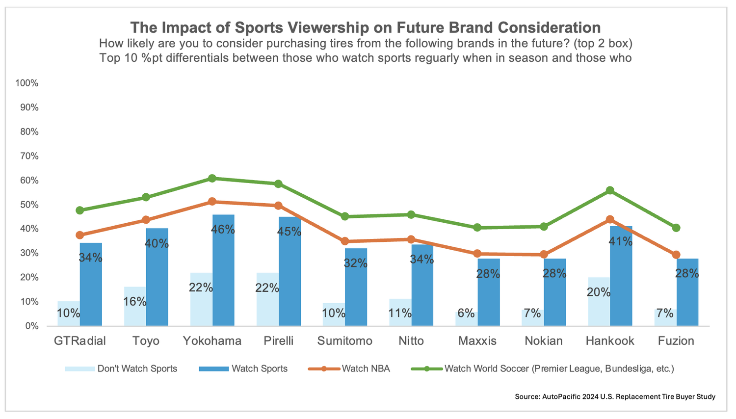 For sports in particular, those who watch sports such as the NFL, NBA, and world soccer regularly when they’re in season are 14-22% points more likely to be familiar with a brand, with the greatest impact on Toyo and GT Radial. Viewership of motorsports such as NASCAR and Formula 1 has an even greater impact than regular sports, ranging from an increase of 14-29% points in brand familiarity compared to those who don’t watch motorsports.