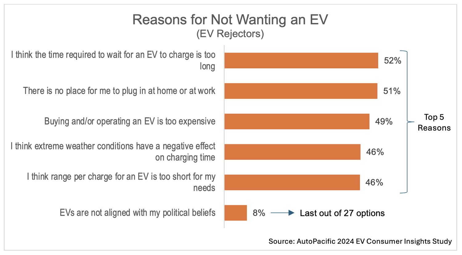 Further investigation reveals that EV Rejectors are becoming less concerned about associating their own political beliefs with owning an EV. In another study finding, just 8% of respondents who will not consider acquiring an EV in the future say it’s because “EVs are not aligned with my political beliefs,” compared to 10% of EV Rejectors in last year’s study. Of those 8%, 62% are Republican, and 13% are Democrat. When it comes to EV rejection, politics do play a small role, albeit a declining one, but rejection of EVs is much more likely to be due to charging and cost concerns. EV rejection has been a focus of AutoPacific’s research in recent years as automakers evaluate their powertrain offerings, deciding between hybrid, PHEV, EV, and hydrogen.